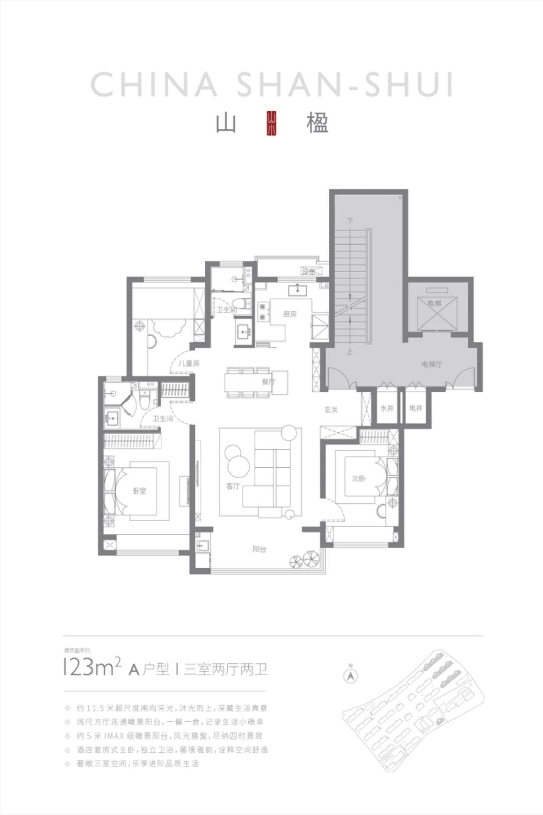 约11.5米超尺度南向采光,沐光而上,深藏生活真意。约5米IMAX级瞰景阳台,酒店套房式主卧,奢敞三室空间,乐享进阶品质生活