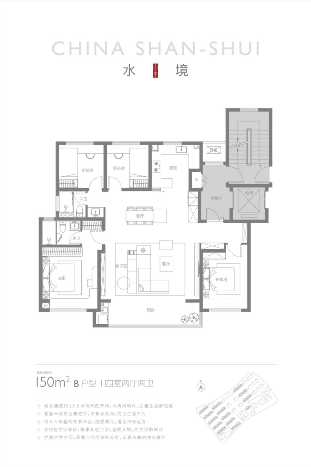 南北通透约13.5米南向四开间,共清风明月,丈量生活舒适度。约6.6米奢阔观景台,揽星邀月,遇见诗与远方